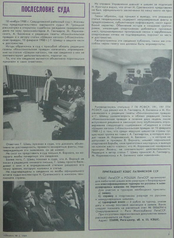 Основные обвинения в мой адрес были по поводу чемпионата СССР 1986 года в Минске и чемпионата Европы 1987 года в Москве. У Швеца был единственный документ — отчёт главного судьи Сретенского о чемпионате Союза 1986 года, где было написано, что Гантварг, Балякин, Кореневский не пропустили В. Вирного в призёры, что-то такое. В решении суда записано, что этот отчёт не был подтверждён, не был представлен в федерацию, как это должно было быть. Кореневский в том чемпионате сделал все ничьи. Как он мог повредить?