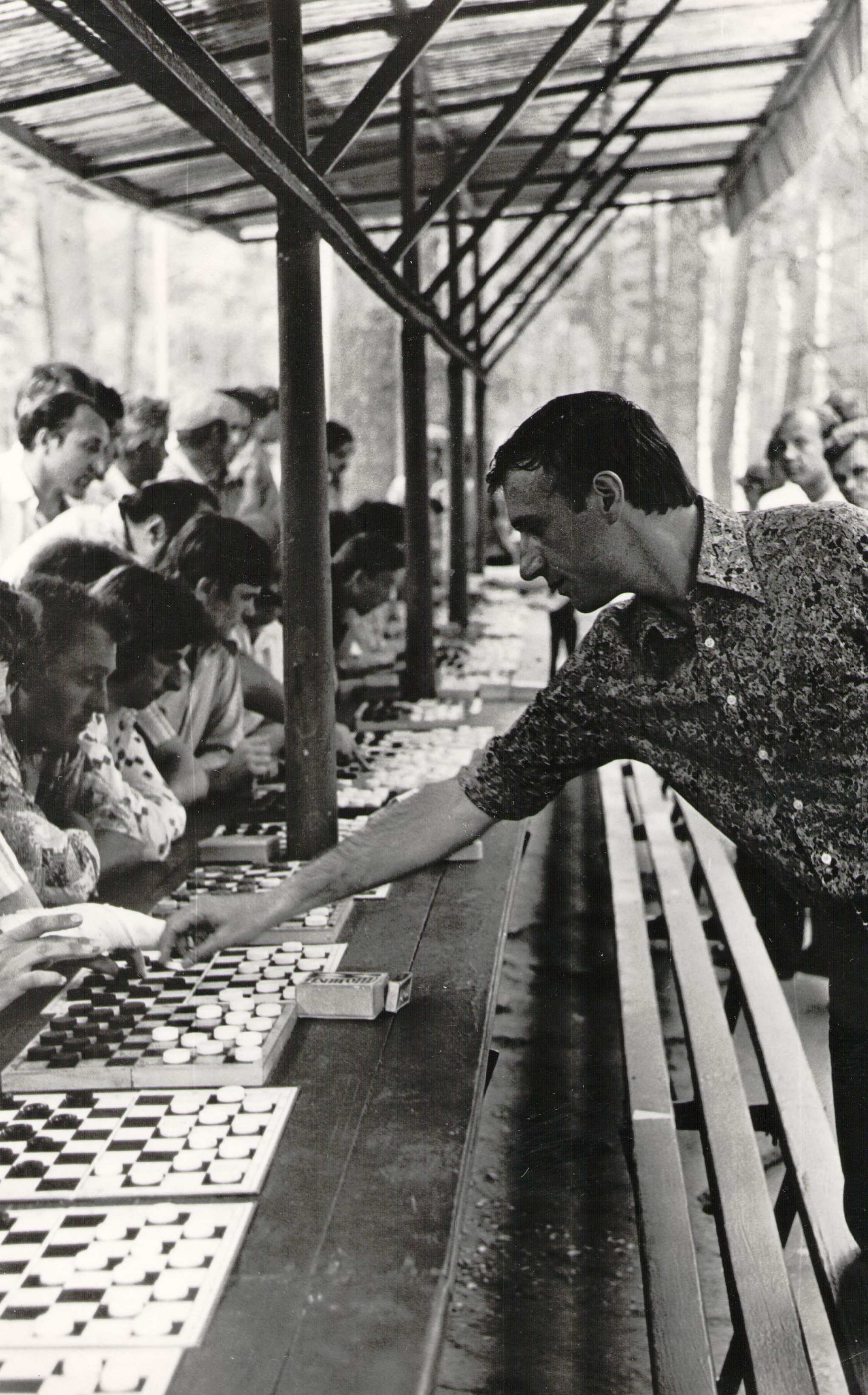 А через полчаса вернулся. И с ним много шпаны, которая явно идёт нас бить. Мы забежали в общежитие и спрятались за фикусы в холле. Заходит эта банда, их предводитель начинает говорить, и я слышу знакомый голос. Выглядываю из-за фикуса и вижу заросшего, со скреплёнными после драки зубами юношу. Вроде бы это Яша Гандлин, с которым мы играли за сборную республики на первенстве Союза. Он был кандидатом в мастера не только по шашкам, но ещё и по боксу. Я из-за фикуса: «Яша?» Он на меня смотрит: «Толик, а что ты здесь делаешь?» Выхожу, наши ребята пытаются дрожащими руками меня обратно за фикус спрятать. Мы садимся за стол и начинаем разговаривать. Всё закончилось мирно. Потом они приходили на некоторые наши игры, болели, кричали. И мы выиграли первенство.