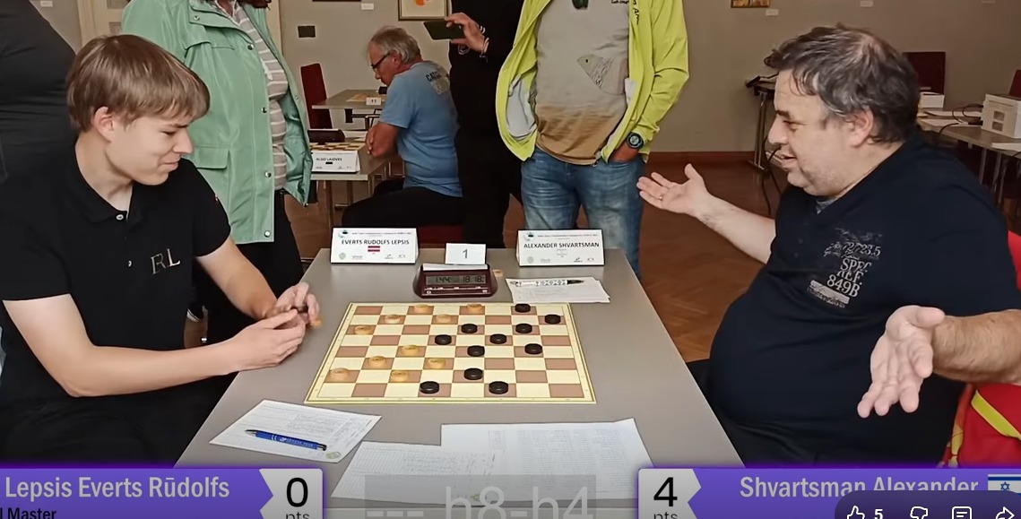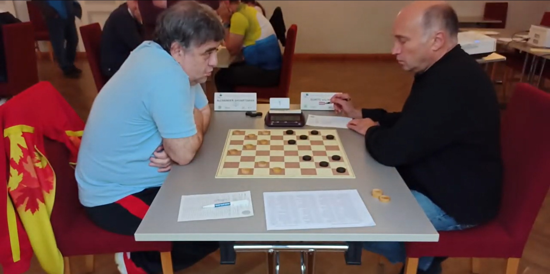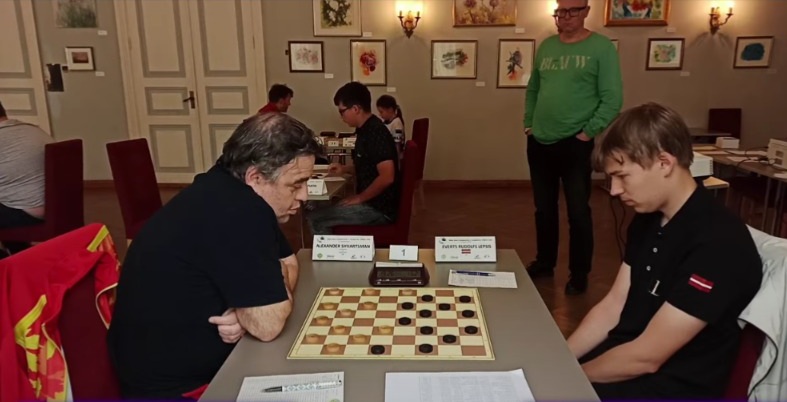Латвийский шашист достаточно вольно трактовал начальные ходы, и уже в скомпрометированной позиции сыграл 4...ab6, предоставив именитому сопернику возможность провести стандартный удар 5.ab4 c:a3 6.fg5 h:f4 7.cb2 a:e3 8.f:d4 h:f2 9.g:a7, оставаясь с лишней шашкой. Но, по признанию Шварцмана, он отказался от удара, так как после 9...ef4 у чёрных оставалась определённая позиционная компенсация, что создавало трудности в реализации преимущества. Поэтому более надёжным он посчитал переход в окончание, которое должно принести победу. |