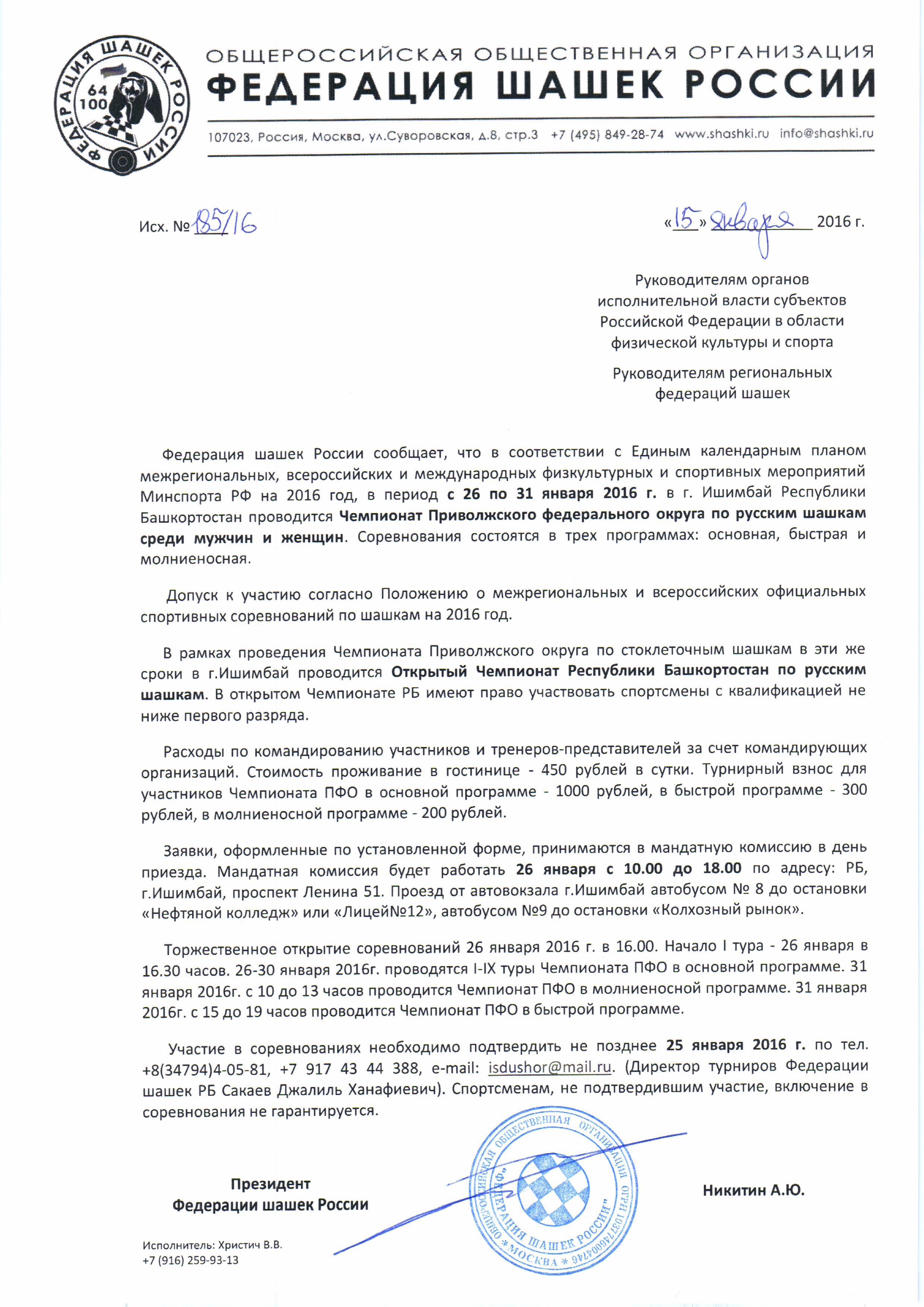 Добавлены положения ближайших турниров (г. Ишимбай): 1. Чемпионат Приволжского федерального округа по русским шашкам, 26-31 января 2. Чемпионат Приволжского федерального округа по международным шашкам, 1-6 февраля |