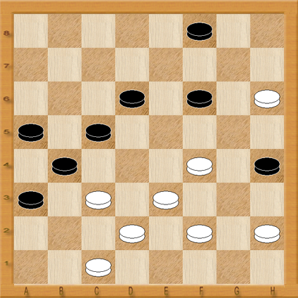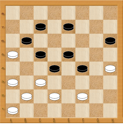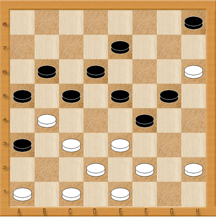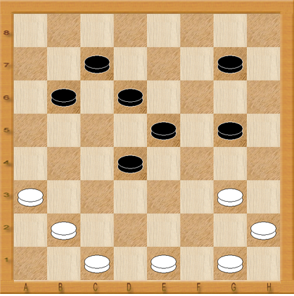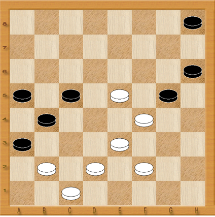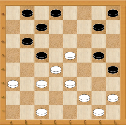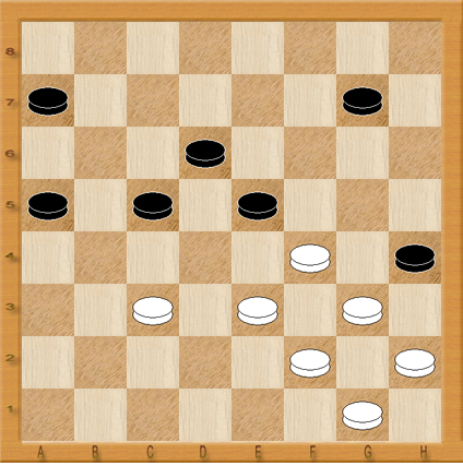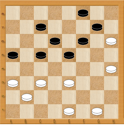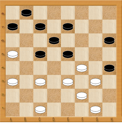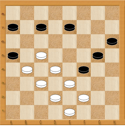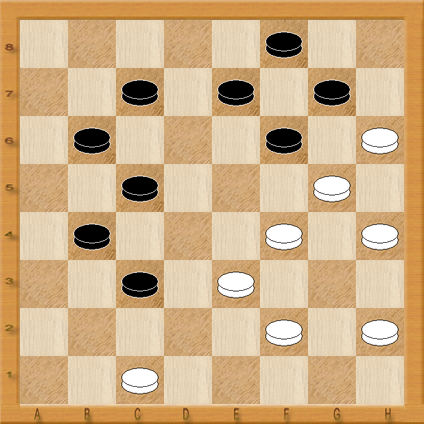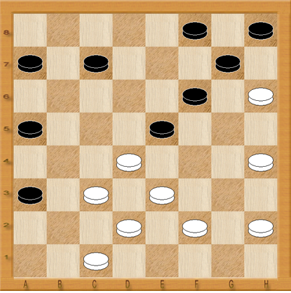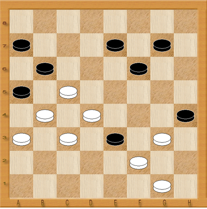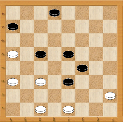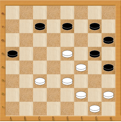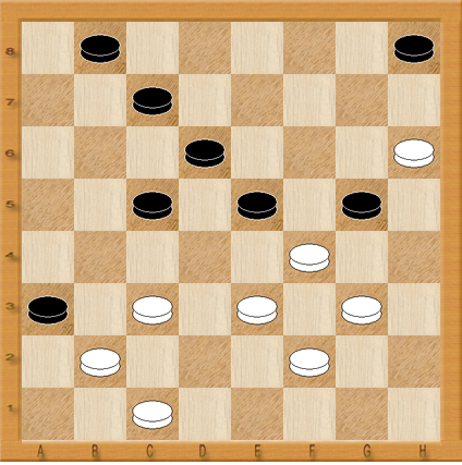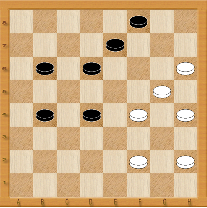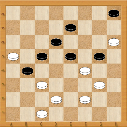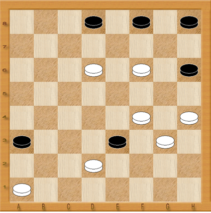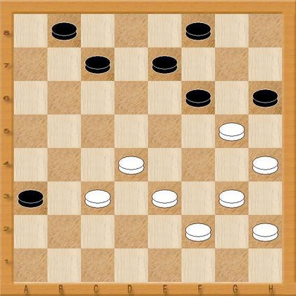 Решение 1.fg3! gh4 2.ef6 hd4 3.fe7 hg5 4.fh6 de3 5.df4 cd4 6.ed8 hg7 ( 6…bc3 7.fe5 X ) 7.hf8 bc3 8.fb4!! ac5 ( 8…ca1 9.bc3 X ) 9.dh4 ca1 10.cb2 ac3 11.fe5 Х